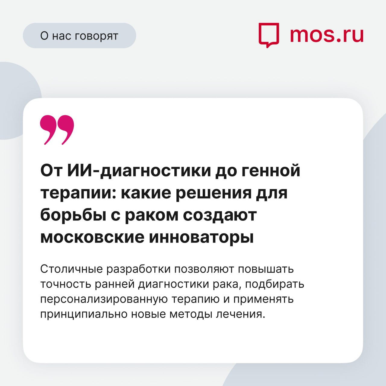 Mos.ru опубликовал статью со списком решений, которые позволяют повышать точность ранней диагностики рака, подбирать персонализированную терапию и применять принципиально новые методы лечения.